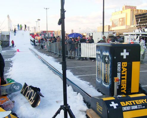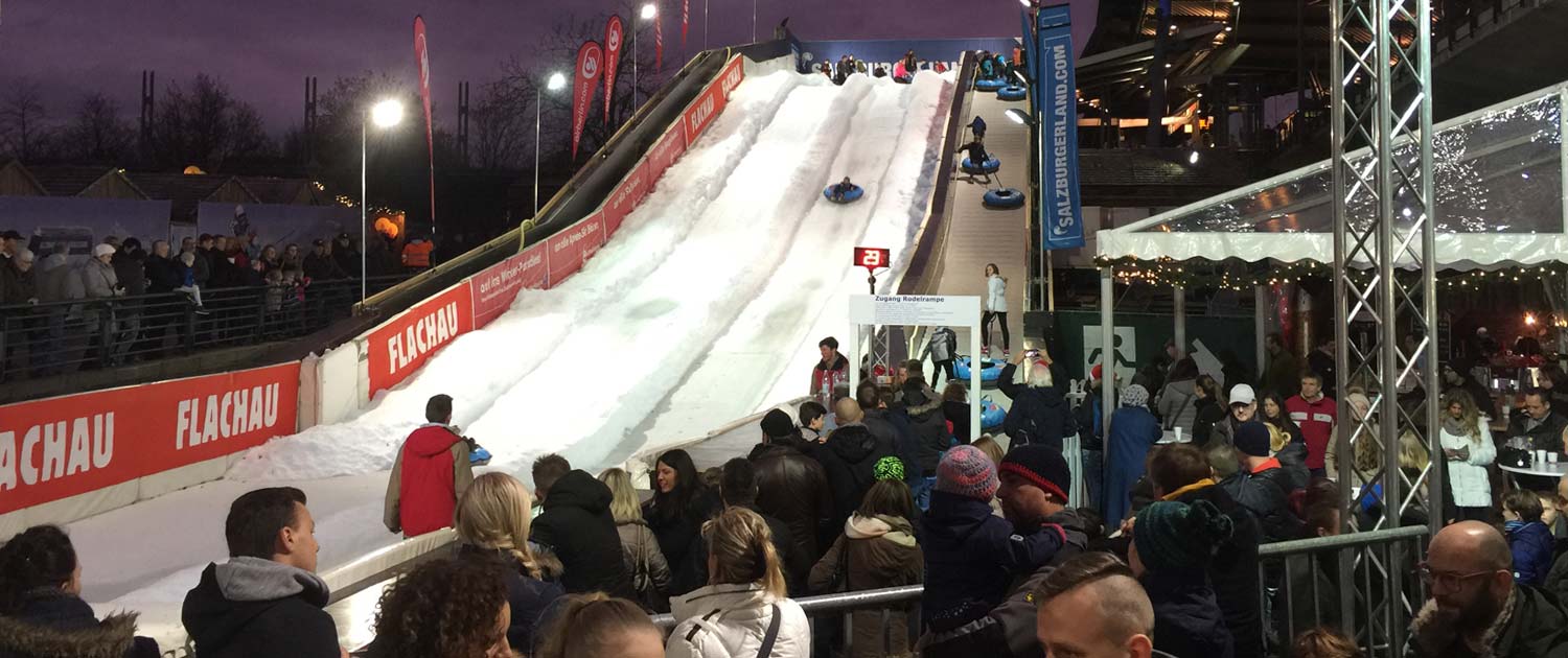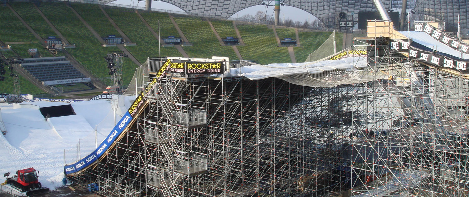 Snow ramps always attract massive attention. Whether you need a small ramp for tobogganing, a huge competition and show ramp for professional sports or a customized construction – we deliver! All our ramps are temporary structures that are constructed to comply with building regulations or TÜV standards. We also provide the safety technology and ramp covers.