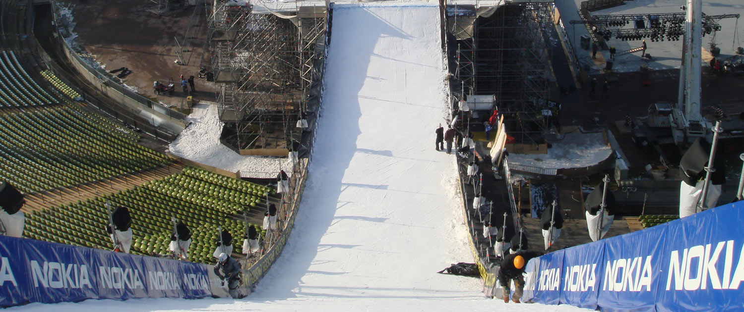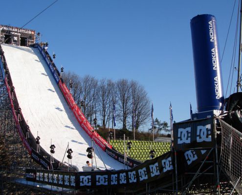 At Big Air events such as NOKIA Air+Style or Skipass Modena, ski and snowboard freestylers show breathtaking jumps and fascinate thousands of spectators. We offer customized Big Air or rail park ramps for major snowboard and freestyle ski competitions and shows.