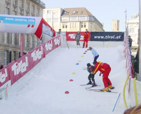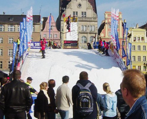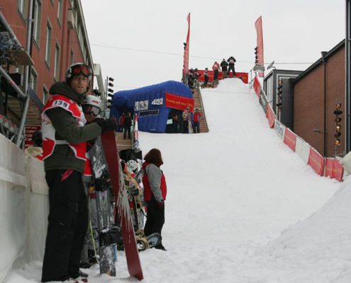A staircase becomes a competition area for freestyle skiers, a wall turns into a halfpipe – no problem at all. We offer professional special constructions such as obstacles, jumps, and halfpipes for freestyle contests.